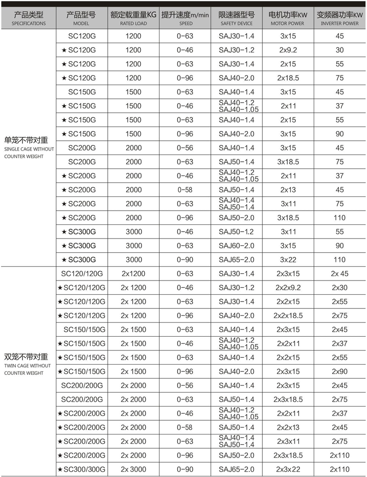 SC系列变频升降机 额定速度:0-46、0-56、0-58、0-63、0-96米/分钟 SC系列变频调速升降机不仅拥有普通梯机械的优点,而且电气上采用知名的西门子控制系统,使升降机性能更优越,优点如下: 1.节能、启动电流小。 2.速度可调,变频控制系统,操作更方便。 3.启制动平稳,制动过程无冲击,运行平稳,乘坐更加舒适。 4.制动平稳,降低机械磨损,使用寿命延长 5.可根据面板跟踪电梯运行情况,并能根据面板提示排除电梯故障,实时监控。 6.可根据需要在本画册“特威选项”中选择具体配置。